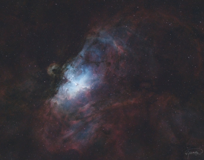 À 7 000 années-lumière de nous, dans la constellation du Serpent, M16 est une pouponnière d’étoiles rendue célèbre par les "Piliers de la Création", ces immenses colonnes de gaz sculptées par les vents stellaires. L’Aigle semble déployer ses ailes au cœur de cette nébuleuse, symbole de puissance et de mystère cosmique. Observer M16, c’est plonger dans l’un des plus grands chefs-d’œuvre du ciel profond.