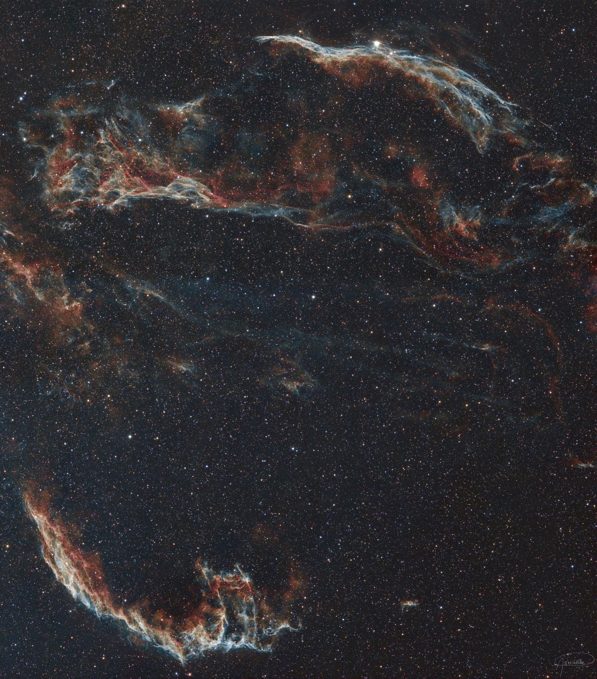 Vestiges d’une supernova vieille d’environ 10 000 ans, les Dentelles du Cygne dessinent de fines arabesques lumineuses dans notre Voie lactée. Situées à environ 2 400 années-lumière, elles témoignent de la mort d’une étoile massive dont l’explosion a projeté ses restes dans l’espace. Ces filaments vaporeux, teintés de bleu et de rouge, offrent l’un des spectacles les plus délicats et fascinants du ciel estival.