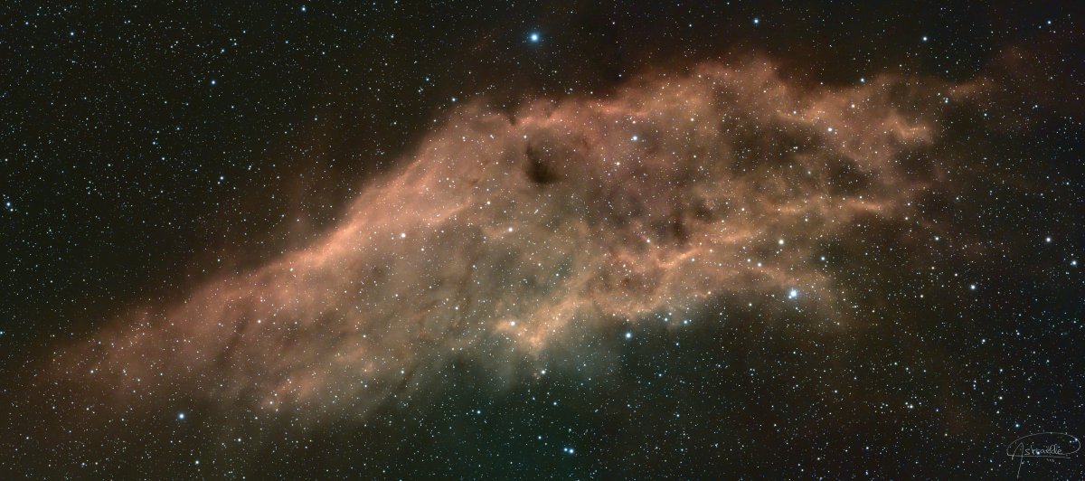 Elle doit son nom à la ressemblance de sa silhouette, visible sur les poses longues, avec la forme de l’État de Californie. Longue d’environ 70 années-lumière, NGC 1499 est située à quelque 1 500 années-lumière de la Terre, ce qui en fait l’une des régions H II les plus proches du Système solaire.