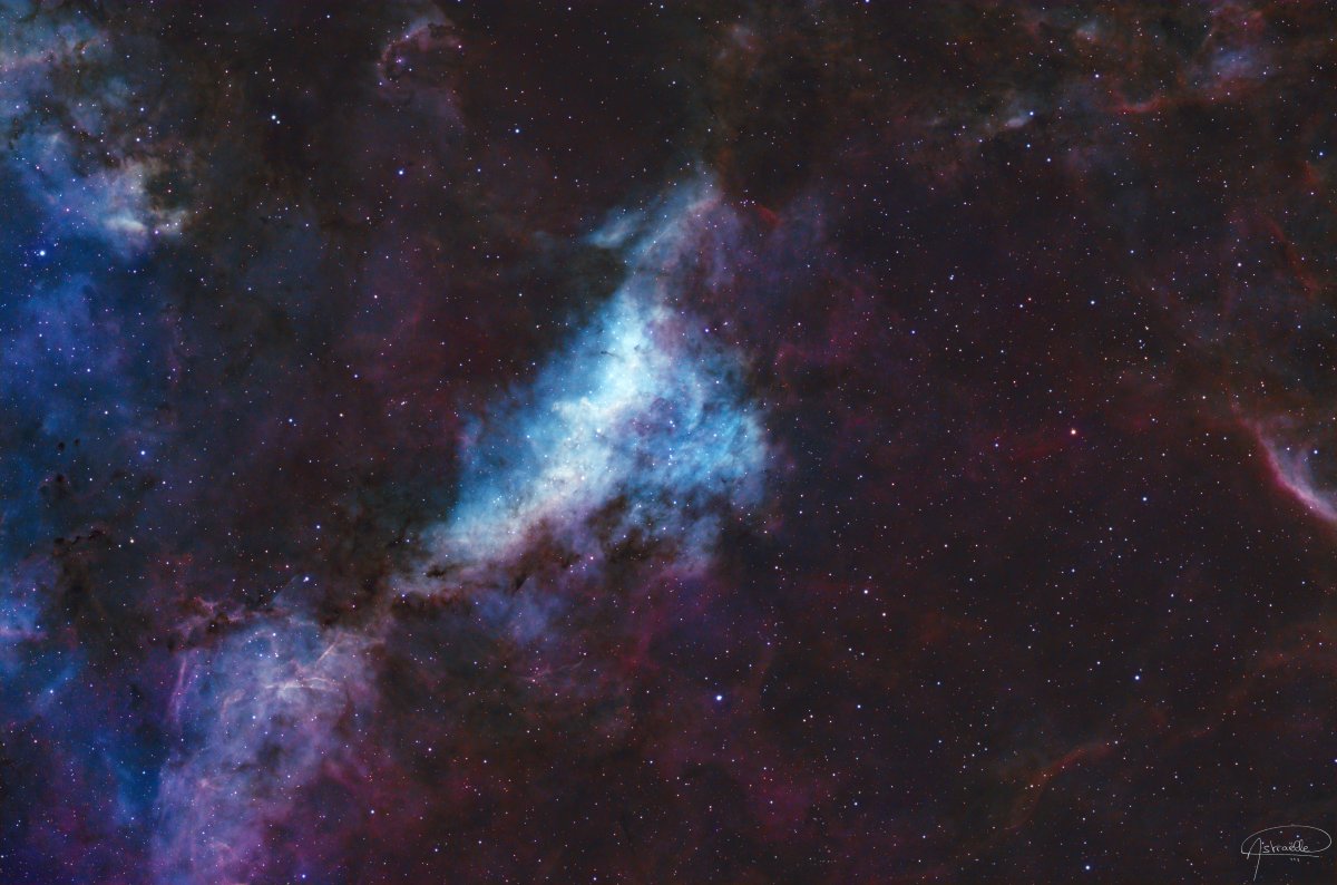 Située à environ 4 000 années-lumière, au cœur de la constellation du Cygne, cette vaste nébuleuse diffuse déploie ses ailes lumineuses dans l’espace. Ses nuages de gaz et de poussière, sculptés par les vents stellaires et l’éclat d’étoiles voisines, dessinent des formes délicates qui rappellent celles d’un papillon en vol. Vue depuis la Terre, elle n’est qu’une lueur ténue dans le ciel, mais en astrophotographie, elle révèle toute la richesse de ses teintes rougeoyantes et de ses volutes cosmiques.
