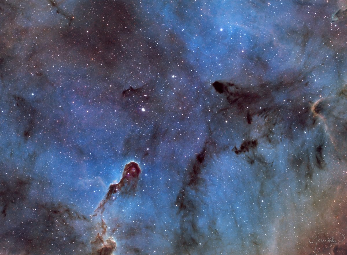 Située à environ 3 000 années-lumière, dans la constellation de Céphée, IC 1396 est une vaste région de gaz et de poussière mêlant nébuleuse d’émission et amas d’étoiles jeunes. En son centre se dessine une formation spectaculaire : la Trompe d’Éléphant, une colonne sombre de gaz dense sculptée par les vents stellaires des étoiles massives voisines.